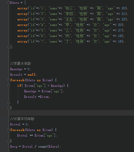 常规的PHP写法,代码分别用于计算数组记录中平均年龄和最大年龄,代码需要循环数组,并把计算结果存入一个标量(单个值,区分于列表变量)。
