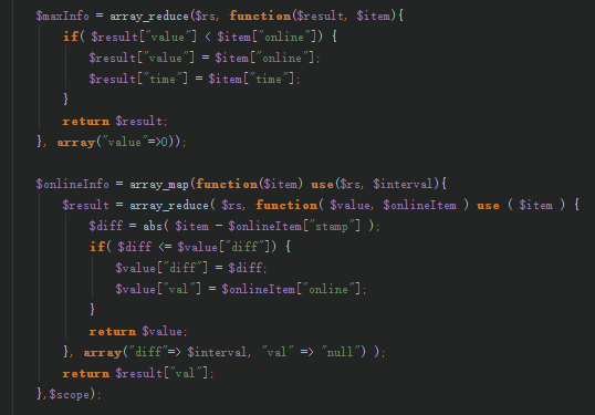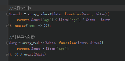 上面的代码是求平均年龄和最大年龄的表达式编程的实现,如果对array_reduce函数的工作机制不了解,看上面两段代码会觉得在看天书。