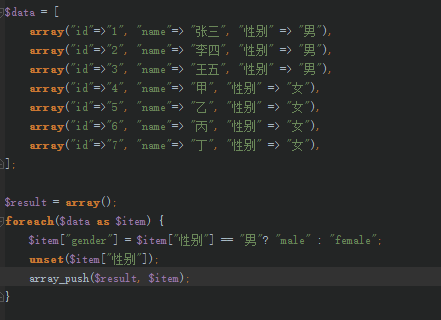 数据中的性别字段是中文的,值也是中文的, 现在想把字段名和字段值都改为英文的, 就可以用上面这段代码实现, 至于实现的逻辑这里不赘述了。